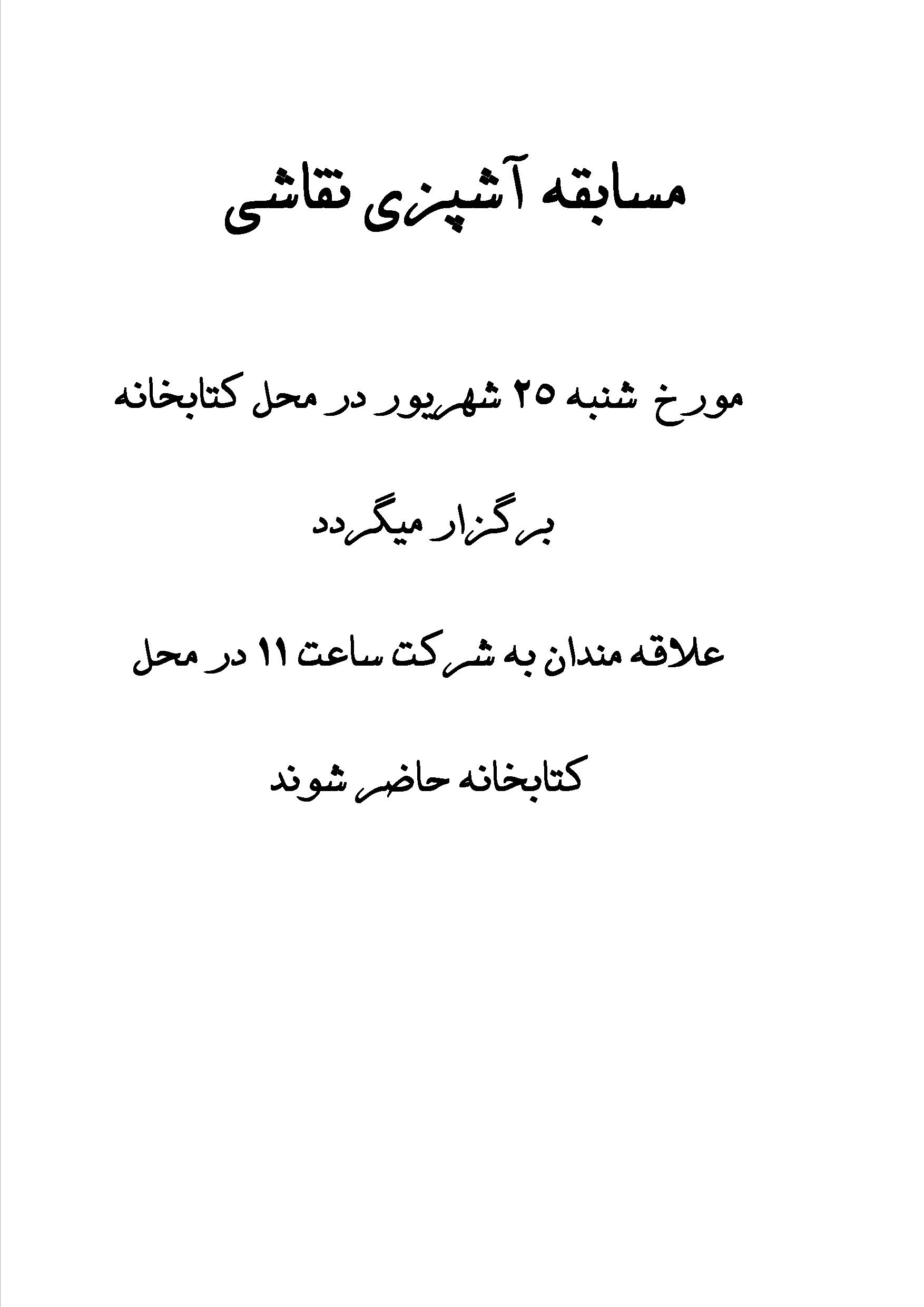 برای ایجاد تنوع و سنجیدن خلاقیت و حضور ذهن کودکان و نوجوانان مسابقه نقاشی آشپزی برگزار گشت در این مسابقه 4 گروه 4 نفره شرکت داشتند که هر گروه یک غذا را انتخاب و در سه یرگه A4 مواد لازم ، دستور پخت، و آماده شده غذا را ترسیم کردند 4 غذای انتخاب شده سوسیس تخم مرغ ، ساندویچ میوه جات، کوکو، املت بودند . این قبیل برنامه ها علاوه بر تازگی برای کودکان و نوجوانان و ایجاد نشاط برای آنها باعث تقویت قوه تفکر آنان نیز میگردد.