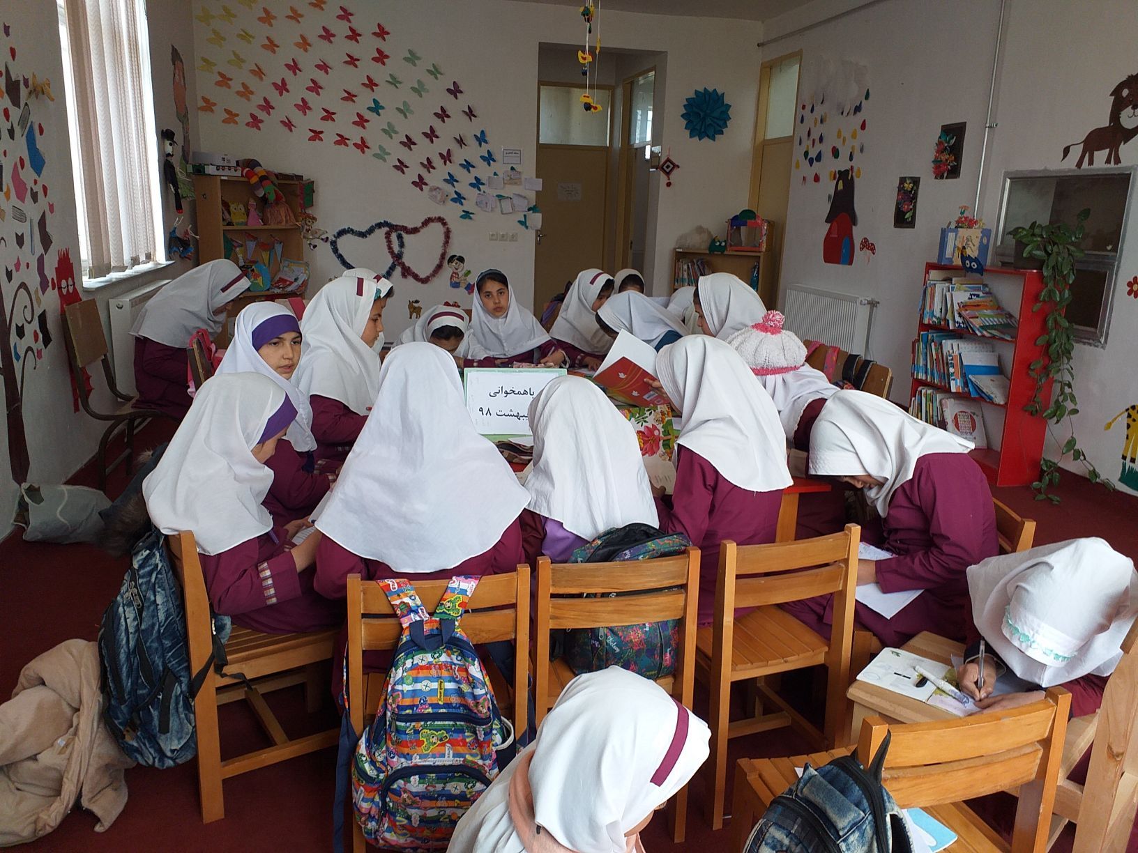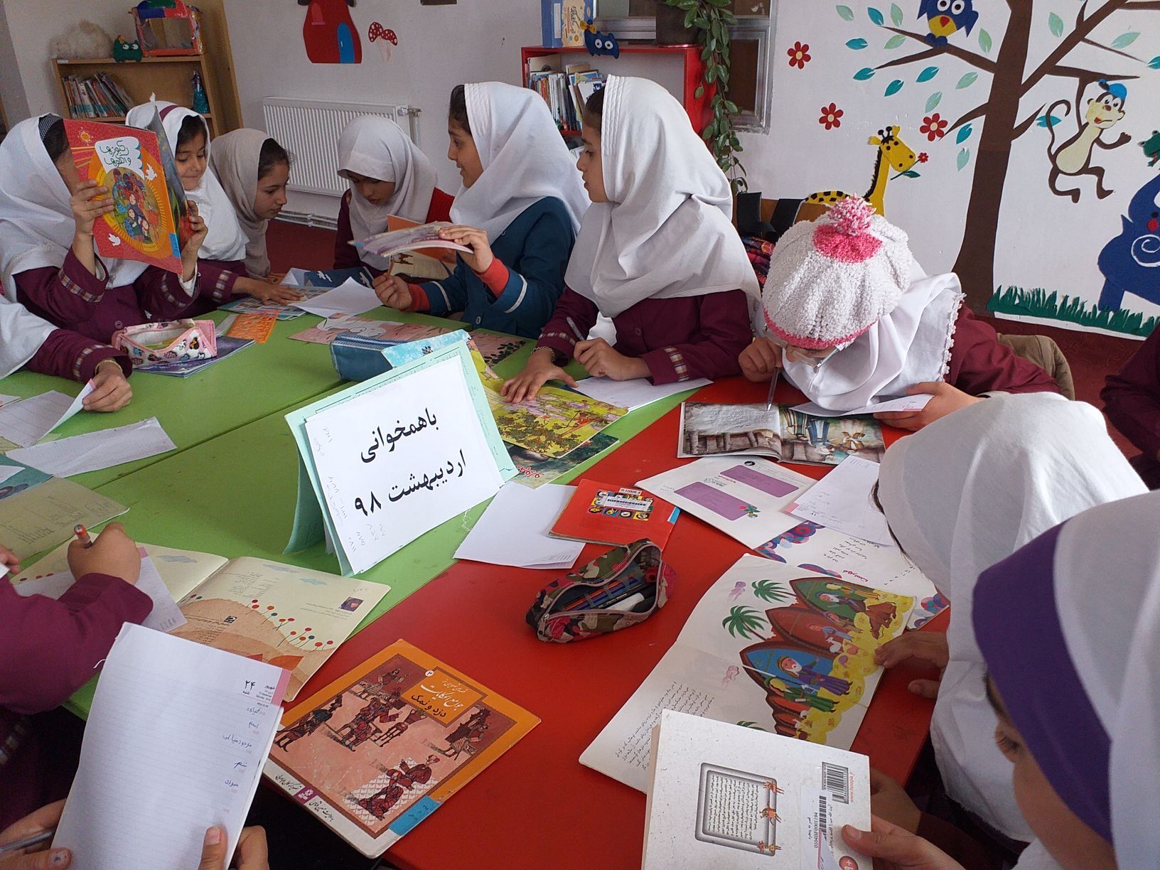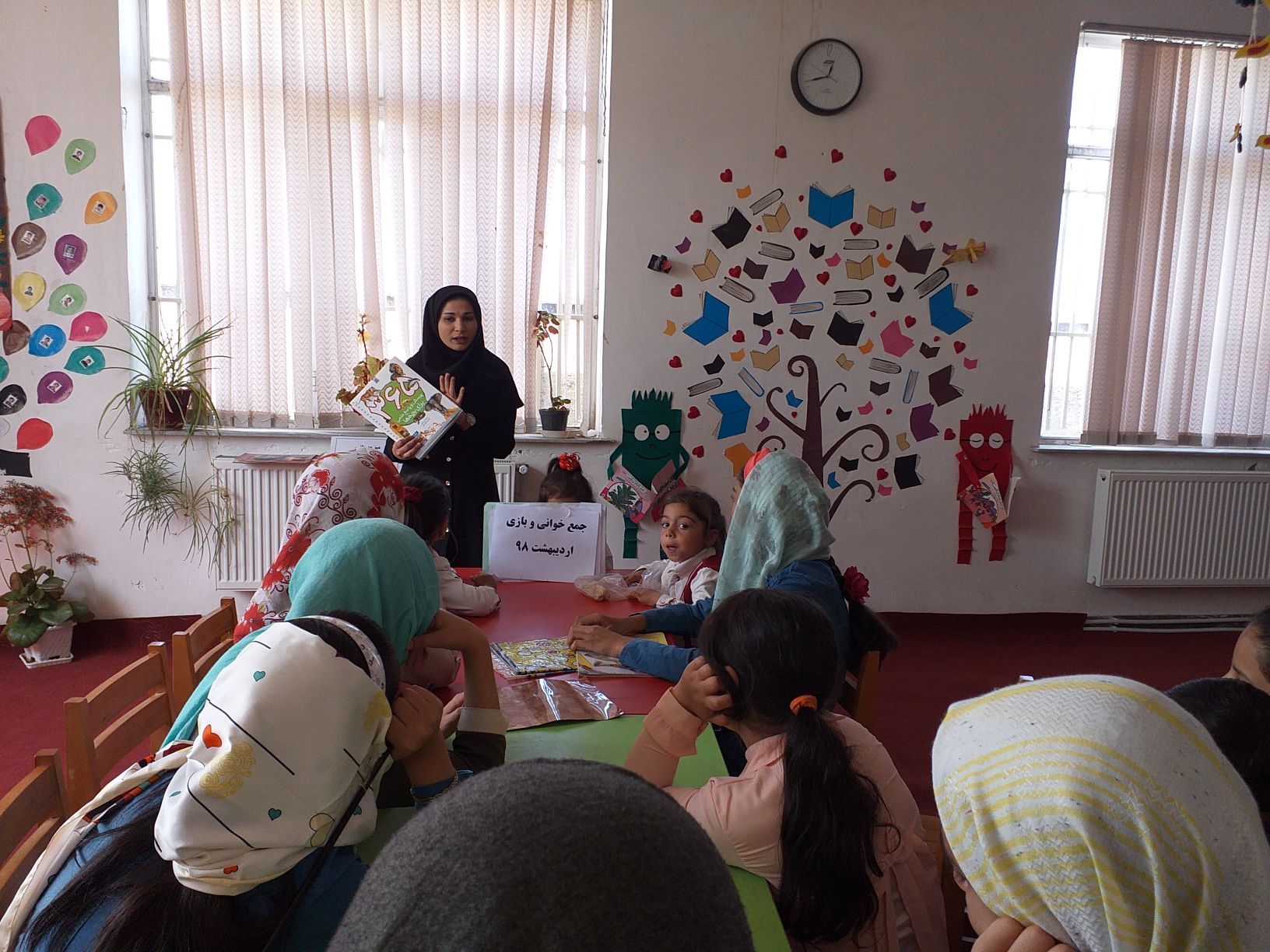 4اردیبهشت 98 جلسه باهمخوانی با شرکت 26 نفر بصورت خلاقانه برگزار گشت در این جلسه کودکان ضمن مطالعه یک قصه بازی اسم شهرت نیز بازی کردند بصورتی که تمام کلماتی که با حروف ( ب، ت، ج، ک )در کتابی که مطالعه میکردند بود را پیدا کرده و نوشتند