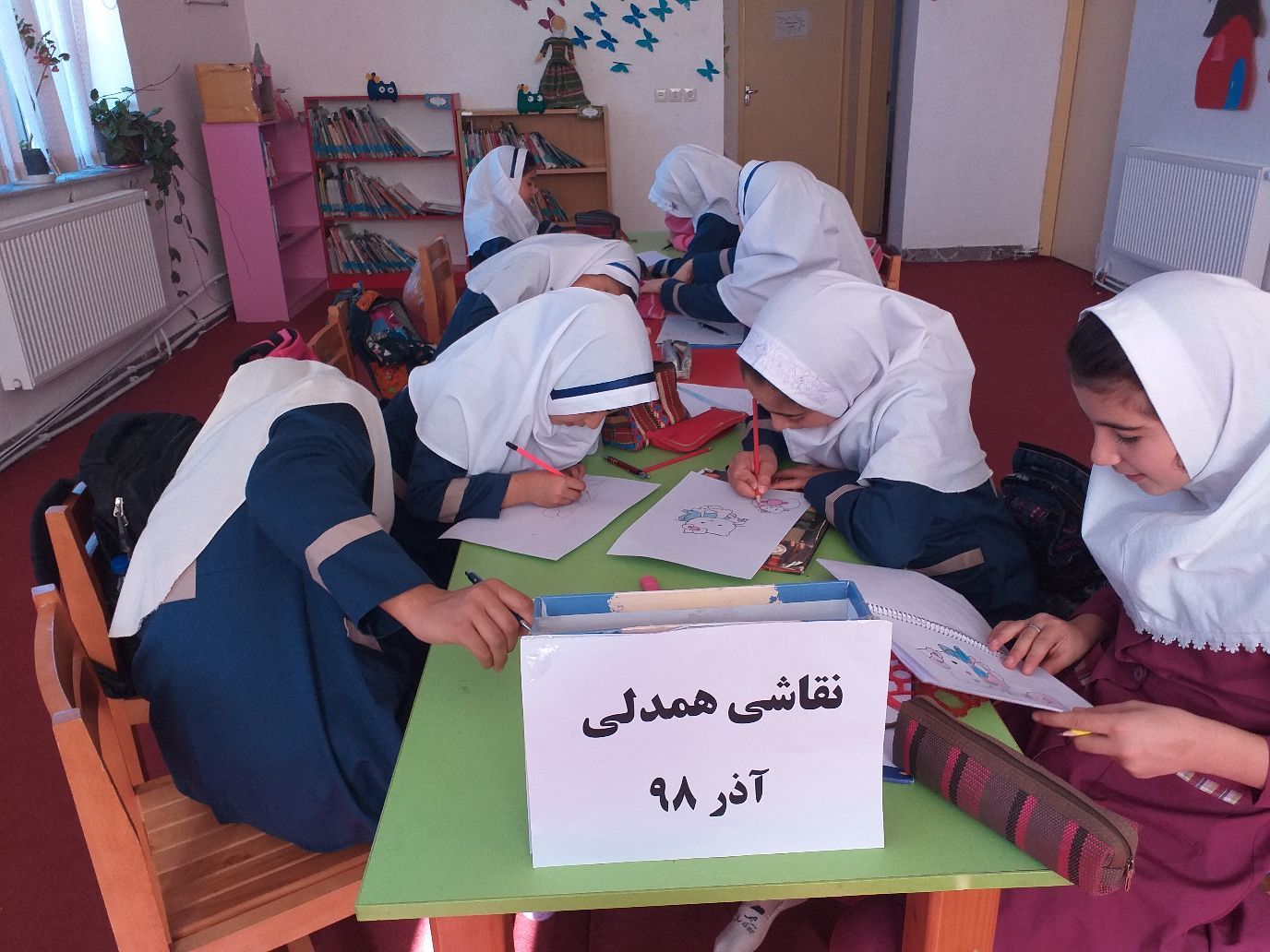 مورخ 3 آذر 98 نقاشی همدلی با هدف پرورش قوه کار گروهی کودکان در کلاس سوم ابتدایی مدرسه شهید محمدی و در کتابخانه با شرکت 13نفر از دختران عضو کتابخانه برگزار گشت